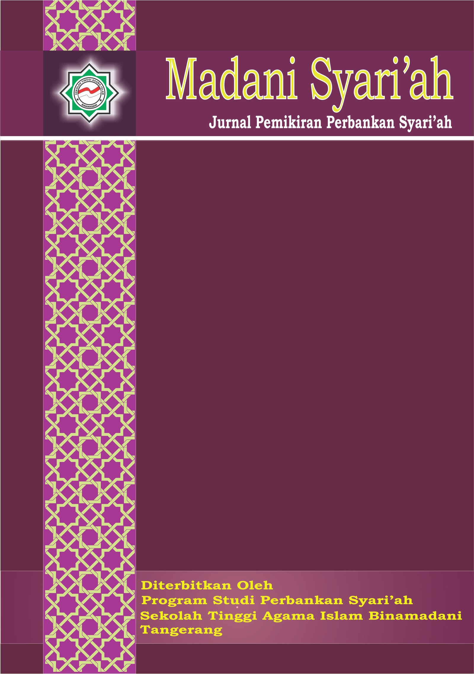Madani Syari'ah: Jurnal Pemikiran Perbankan Syariah diterbitkan oleh Program Studi Perbankan Syariah Sekolah Tinggi Agama Islam (STAI) Binamadani, Tangerang. Bidang kajian jurnal ini mencakup pemikiran tentang perbankan syariah, sistem informasi perbankan syariah, manajemen risiko perbankan syariah, manajemen marketing perbankan syariah, manajemen lembaga keuangan syariah, etika keuangan syariah, sistem ekonomi Islam, dan lainnya.